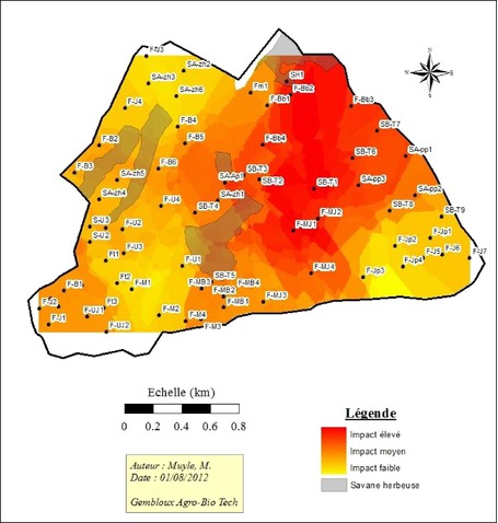 Figure 26 : Carte de répartition de l'intensité des dégâts effectués par la grande faune sur la végétation dans le site de Mikembo 60 Les trois placettes avec le plus grand pourcentage d'impact sont SA-pp1 (50%), SB-T8 (45.2%) et SB-T3 (39.5%) et se trouvent dans la zone d'impact élevé. SA-pp1 est une savane arborée à Acacia spp. et les deux autres sont des savanes boisées. Si l'on observe les espèces impactées à plus de 20 %, nous constatons que les quelques espèces avec les plus hauts pourcentages sont principalement des espèces de savanes boisées (tableau 25). Au total, 52 espèces ont subi un dégât de gibier. Tableau 25 : Pourcentage des espèces les plus impactées par la faune