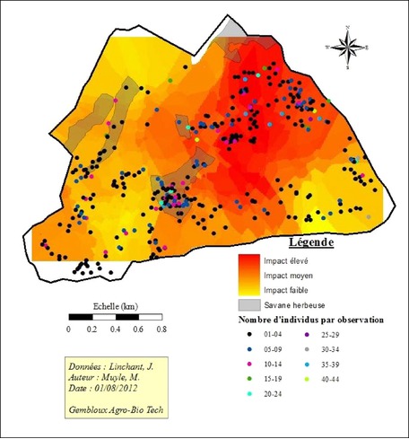 Figure 29 : Régressions entre les constituants de la biomasse herbacée et le pourcentage de dégâts (p-value significative) 64 5.3.3. Lien avec un inventaire de faune effectué à la même période Chaque observation a été replacée sur la carte de répartition de l'intensité des impacts (figure 30). Il apparait qu'il y a un grand nombre d'observations dans la zone d'impact élevé. D'autres zones comportent de nombreuses observations : il s'agit des savanes herbeuses, qui ne ressortent pas dans la carte de répartition des dégâts. En effet, les dégâts ont été inventoriés sur les arbres, or il n'y a pas ou peu d'arbres dans les savanes herbeuses.