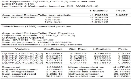 modélisation ARIMA(p, 4, q) du cycle.