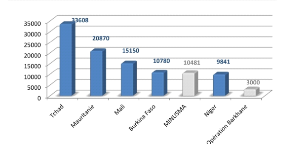PARAGRAPHE I : L'EFFECTIF GLOBAL DES TROUPES TCHADIENNES AU SEIN DU G5 SAHEL ET DE LA FORCE MULTINATIONALE MIXTE DE LA CBLTLa région du Sahel et du Bassin du Lac-Tchad englobant des pays comme le Mali, le Burkina Faso, le Niger, la Mauritanie, le Nigeria, le Cameroun et aussi le Tchad, fait face à des défis sécuritaires majeurs et interconnectés depuis 2010. Ces défis dérivent de l'interaction complexe entre des facteurs politiques, socio-économiques et sécuritaires. Pour une meilleure appréhension de ces défis, nous aborderons dans un premier temps les menaces sécuritaires (A) proprement dites avant de démontrer les défis d'ordre humanitaire (B).A- LE PERSONNEL MILITAIRE TCHADIEN AU SEIN DU G5 SAHELLES MENACES SECURITAIRES Depuis quelques années, la région du Sahel et du Bassin du Lac-Tchad est devenue le théâtre des activités criminelles de tout genre orchestrées généralement par les groupes terroristes (1) se livrant à des trafics de tout genre (2). LES PRINCIPAUX GROUPES TERRORISTES Avant de détailler les différents groupes djihadistes opérant dans cette région, il faut d'abord comprendre que la plupart d'entre eux ont émergé à la suite de la chute du régime de Kadhafi en 2011 en Libye, ayant occasionné la prolifération d'armes et fragilisé les frontières entre les différents Etats de cette zone. Parmi ces groupes, nous avons entre autres : BOKO HARAM : Ce mouvement terroriste a été formé en 2002 au Nord-est du Nigeria par MUHAMMAD YUSUF. Ce dernier a dirigé le groupe jusqu'à sa mort en 2009. Il sera ensuite remplacé par ABUBAKAR SHEKAU, qui sera aussi déclaré mort le 17 juin 2021 par BAKURA MODU (le désormais nouveau chef de l'organisation). SHEKAU aurait été tué à la suite des affrontements avec un autre groupe dissident40(*). Boko Haram opère principalement dans le bassin du Lac-Tchad, c'est-à-dire dans des pays comme le Cameroun, le Niger, le Nigeria et le Tchad. Les stratégies de Boko Haram incluent des attaques terroristes, des enlèvements massifs, des attentats suicides, des raids destructeurs et des affrontements armés avec les forces de défense et de sécurité. Le groupe se sert donc de la violence pour semer la terreur tout en affaiblissant les gouvernements locaux et imposer sa propre interprétation de la religion islamique. Les activités de ce groupe ont considérablement impacté la sécurité sous régionale, allant jusqu'à créer un climat d'insécurité généralisé, forçant ainsi les populations des zones touchées à se déplacer massivement, perturbant ainsi les activités économiques et violant surtout les droits de l'homme. AQMI (ALQAIDA AU MAGHREB ISLAMIQUE) : Ce mouvement est né de la restructuration du Groupe Salafiste pour la Prédication et le Combat (GSPC)algérien, qui a changé de nom en 2007 après avoir rejoint le réseau ALQAIDA. Ce groupe a été formé dans un contexte de violence extrême et de guerre civile en Algérie, où les militants islamistes ont cherché à instaurer un Etat islamique. L'idéologie prônée par AQMI est l'établissement d'un Califat41(*) et à l'instauration la Charia dans les régions qu'elle contrôle. Les objectifs de ce mouvement est la lutte contre l'influence occidentale en Afrique du Nord, plus particulièrement celle de la France et des États-Unis. AQMI utilise plusieurs stratégies pour mener ses activités : le terrorisme ciblé (c'est-à-dire des attentats dirigés contre des cibles militaires ou civiles), le kidnapping (prises d'otages, précisément des étrangers, contre des paiements de rançons)42(*), le réseautage et les alliances, ainsi que l'exploitation illégale des ressources naturelles des territoires dont ils ont le contrôle. Les activitésmaléfiques d'AQMI ont considérablementdégradé la stabilité politique et sociale dans des pays comme le Mali, le Niger ou encore le Burkina Faso.43(*)De nombreux réfugiés ont été donc obligés de fuir leurs localités à cause des actions criminelles de cette organisation. ANSAR AL SUNNA :« C'est un mouvement djihadiste soudanais signifiantlittéralement «Adeptes des traditions du Prophète Mohammad », qui s'estétendu notamment au Tchad où il désigne les religieux réformistesopposés aux Tidjanes. Ces derniers, qui contrôlent le Conseil Supérieur des Affaires Islamiques (CSAI), ont parfois blâmé les Ansar pour leur influence et leurs positions idéologiques sur la construction de l'extrémisme religieux au Tchad. »44(*) GSIM (GROUPE DE SOUTIEN A L'ISLAM ET AUX MUSULMANS) : C'est aujourd'hui l'une des plus puissantes organisations islamistes au Sahel (JNIM en arabe). Elle est passée sous la bannière d'Al-Qaida après avoir prêté allégeance en 2017.Elle est aussi affiliée à ANSAR DINE d'IYAD Ag Ghaly et à KATIBA MACINA de Amadou KOUFA. D'après les données fournies par les Forces françaises présentes au Sahel, l'effectif du GSIM varie entre 2000 à 3000 hommes armés. Son leader Ag GHALY est un redoutable Chef rebelle Touareg reconnu des services de renseignements occidentaux depuis 1990 et qui entretenait des relations avec le mouvement rebelle indépendantiste touareg MNLA (Mouvement National pour la Libération de l'Azawad). AL MOURABITOUNE : C'est un groupe extrémiste créé en 2015 en Libye par MOKHTAR Bel Mokhtar, l'un des plus redoutés chefs terroristes de nationalité algérienne et son complice le malien Abderrahmane Ould EL-AMAR. Le groupe établit dans un premier temps son fief à Sebha au sud de la Libye, avant de s'étendre au Niger et au Mali en profitant des nombreuses complicités locales. L'objectif affiché par cette organisation est de créer un mouvement d'envergure continentale regroupant tous les combattants et les musulmans d'Afrique. Idéologiquement parlant, Al-Mourabitoune s'inspire d'Al-Qaida et des Talibans sous le leadership de leurs chefs respectifs, AYMAN Al-Zawahiri et MOHAMMAD Omar, surnommé communément MOLLAH OMAR. Au premier trimestre