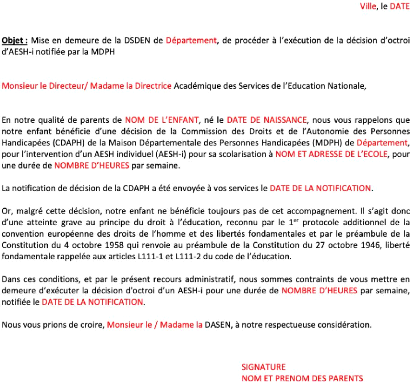 Annexe 2 : Modèle de courrier de mise en demeure pour l'absence d'un AESH