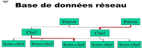 Figure 3 : BDD réseau I.2.2.3. Les bases de données relationnellesC'est le type de bases que l'on connaît et que l'on pratique aujourd'hui. Basé sur l'algèbre relationnel, il permet de modéliser facilement et sans grosse contraintes les systèmes du monde réel et de créer des bases de données simples à maintenir, à faire évoluer et indépendantes de leur support. Dans ce type de bases de données, les données sont organisées en tables. C'est la technologie majeure en bases de données depuis les années 1980. I.2.2.4. Les bases de données objet12 regroupées sous forme d'objets : un conteneur logique qui englobe des informations et des traitements relatifs à une chose du monde réel. Les bases de données à objets sont mises en oeuvre par un système de gestion de base de données objet logiciel qui manipule le contenu de la base de données et un programme écrit dans un langage de programmation orientée objet. Les premiers systèmes de gestion de bases de données à objets sont apparus dans les années 1990, en même temps que se sont répandus les langages de programmation orientés objet. 2.3 Système de gestion de bases de données (SGBD)