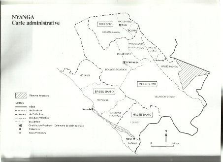 Conclusion de la première partieCette première partie que nous venons de clore nous a permis de comprendre d'abord les concepts clés de notre étude. C'est à cet effet, que nous avons défini l'aménagement que même si les définitions varient d'un auteur à un autre mais tous s'accordent sur le fait que c'est un ensemble d'actions concertées visant à disposer avec ordre les habitants. C'est dans cet optique que l'aménagement est un ensemble de modifications foncières et/ou de constructions qui visent à adapter un morceau de territoire local à une nouvelle fonction. Par ailleurs, s'agissant des politiques urbaines au Gabon, la majeure partie des diagnostics ne se sont portés que sur la ville de Libreville. Les autres villes qui ont un qualificatif de petite ville à l'instar de Tchibanga n'a pas attiré l'attention des différents gouvernements qui se sont succédé. Ensuite, tout au long de cette partie, nous avons fait un historique et avons également donné les missions de la Direction Générale de l'Urbanisme et des Aménagements Fonciers (DGUAF). Ainsi, nous avons pu montrer que cette administration est chargée d'assurer l'exécution des politiques de Ministère de l'urbanisme en matière d'aménagement. Mais face aux insuffisances de cette administrations en matière d'urbanisme, l'Etat a créé par le décret n°0702/PR/MPITPTHAT du 17 juillet 2013 l'Agence Nationale de l'Urbanisme, des Travaux Topographiques et du Cadastre (l'ANUTTC). Par ailleurs, lors de son fonctionnement nous avons pu établir un chevauchement des compétences entre la DGUAF et l'ANUTTC. C'est ainsi que nous avons également présenté les principaux outils d'aménagement urbain retenu par le législateur gabonais que sont le Schéma Directeur d'Aménagement Urbain (SDAU) et le Plan d'occupation des Sols (POS). Enfin, nous avons fustigé le processus d'élaboration de ces deux outils car les experts commis pour la réalisation de ces documents n'associent par les populations qui sont directement concerné à l'élaboration. DEUXIEME PARTIE CADRE PHYSIQUE DE L'ÉTUDE, ÉTATS DES LIEUX DES POLITIQUES URBAINES ET PROPOSITION D'INTRODUCTION DES OUTILS D'AMÉNAGEMENT URBAIN AU LYCEE Cette deuxième partie est subdivisée comme la précédente en trois (3) chapitres. Il s'agira pour nous dans ce premier chapitre de faire une présentation de la ville de Tchibanga. Dans cette présentation deux aspects sont retenus à savoir le milieu physique et le cadre humain. Tout au long du deuxième chapitre nous ferons un état des lieux des politiques d'aménagement initié à Tchibanga. C'est ainsi que nous irons à la rencontre du Directeur provincial du cadastre et de l'urbanisme, du premier maire adjoint et des populations. Avant de clore ce chapitre, nous présenterons le paysage urbain et l'apport de la Banque Mondiale à travers le Plan de Développement des Infrastructures Locales (PDIL) pour doter la ville des outils d'aménagement. Dans le troisième chapitre de cette partie nous ferons l'analyse d'une partie du curriculum en vue d'introduire les outils d'aménagement urbain dans le contenu d'une leçon de géographie en classe de 1ere. Mais avant de le faire, nous allons nous rapprocher des enseignants d'histoire et géographie de la ville de Tchibanga afin d'avoir leur avis sur la réalisation de ce projet. A la fin de ce chapitre, nous ferons une proposition non pas de leçon mais du contenu de la leçon ayant pour titre l'urbanisation au Gabon et ses conséquences. CHAPITRE IV : DÉTERMINANTS PHYSIQUES ET HUMAINS DE L'AMÉNAGEMENT DE LA VILLE DE TCHIBANGA L'étude des déterminants de l'aménagement de la ville permet non seulement de décrire les aspects du site, de la population, mais aussi d'expliquer son influence sur l'organisation et les formes d'occupations et d'aménagement de l'espace. Dans ce chapitre nous ferons une localisation géographique et une présenterons la province de la Nyanga, la commune de Tchibanga. Le déterminant humain sera aussi aborder. 1. Localisation géographique et présentation de la province de la Nyanga 1.1. Localisation géographique La province de la Nyanga est située au Sud du Gabon. Elle est limitée au Nord par la province de la Ngounié, au Nord-Ouest par l'Ogooué-Maritime, à l'Ouest par l'Océan Atlantique et au Sud-Est par la République du Congo. La capitale provinciale est Tchibanga. 1.2. Présentation de la province de la Nyanga Avec une superficie de 21 285 km2, la province de la Nyanga occupe 7,95% du territoire national. Elle est en termes de superficie, la 7ème province du Gabon. Cette province tire sa dénomination du fleuve Nyanga. Ladite province est subdivisée en six (6) départements que sont Mougoutsi, Basse-Banio, Douigny, Doutsila, Haute-Banio et Mongo. La ville de Tchibanga est la capitale de la province et se localise dans le département de Mougoutsi En effet, Tchibanga est un toponyme qui tire son nom d'une colline située à proximité de la ville que les autochtones punu ont appelé « Yibang ». Carte 1. Localisation et présentation administrative de la province