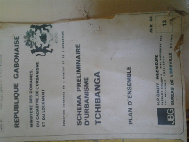 1.1.6. 1. Diagnostic de l'urbanisme à TchibangaSelon le chef de service de l'urbanisation, contrairement à la ville de Libreville qui a faitl'objet de plusieursessais de planification de 1939 à 2010à savoirs : le plan colonial de 1939 ; le plan de 1962, le plan d'Olivo-Prass de 1965, le (SDAU) de 2005 et le (SDAU) de 2010, la ville de Tchibanga ne dispose qu'un Schéma préliminaire d'urbanisme dont l'élaboration a débuté en 1975 et s'est achevée dans les années 1984 d'après Après l'expiration de ce document, ce dernier n'a pas été renouvelé. L'existence des documents dans les années 80 a donné naissance à une ancienne ville harmonieuse, assez structurée et assez fonctionnelle eu égard à la présence d'un maillage des servitudes où les voies primaires forment des boucles et communiquent avec les voies secondaires. La ville a néanmoins été dotée d'autres outils de planification dont un plan d'occupation du sol. La plupart de ces outils de gestion spatiale et d'urbanisme qui avaient été conçus pour la plupart d'entre eux sont aujourd'hui caducs et donc inopérants à la Direction provinciale du Cadastre et de l'urbanisme. De ce fait, on en déduit donc que l'évolution de la ville s'est et se fait au détriment des outils de planification et de tout règlement d'urbanisme. Aujourd'hui, l'urbanisation galopante se fait sans une cohérence. Les extensions urbaines des quartiers périphériques, sous-équipées et montrent des insuffisances dans leur raccordement à l'ancienne ville. Ainsi les nouvelles extensions manquent de continuité avec la trame de voirie découlant de l'ancien document de planification qui est le schéma préliminaire d'urbanisme de 1984. Photo 1: Couverture du Schéma préliminaire d'urbanisme de la ville de Tchibanga