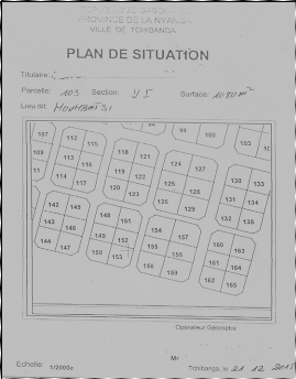 Source. Direction provinciale de l'habitat, de l'urbanisme et du cadre de vie de la Nyanga Somme toute, la participation des populations dans l'effort d'aménagement urbain peut être une solution envisageable et à adapter. Dans cet état de chose, nous pensons que l'aménagement urbain participatif et l'urbanisme participatif est la clef de la ville de Tchibanga. La recherche des nouveaux acteurs trouvent son fondement dans le souci d'améliorer le cadre et les conditions de vie des populations. S'agissant de la deuxième initiative, c'est l'entreprise RAMEZ qui avait été sollicité par l'Etat pour la réalisation de deux projets de lotissements de chacun 20 hectares. A savoir à Mavoundi dans le 2em arrondissement et à Pola dans le 1er arrondissement. Ces travaux ont été préfinancés par l'entreprise. Mais suite aux besoins de renforcement des équipes lors de la construction des infrastructures pour l'organisation de la CAN de 2012 co-organisée par le Gabon et la Guinée Equatoriale, le projet fut stoppé et abandonné. Le projet n'a pas été poursuivi suite aux impayés de l'Etat gabonais et pourtant réalisé à plus de 80% celui de Pola dans le 1er arrondissement. Quant à celui de Mikoulengui au quartier Mavoundi dans le 2em arrondissement a été arrêté pour des raisons techniques suite à la mauvaise lecture et qu'il faut refaire de nouveaux levés topographiques. Les services du cadastre et de l'urbanisme ne peuvent ne peuvent pas concéder lesdites parcelles aux populations requérantes suite à une absence de plans. La société RAMEZ en remontant sur Libreville a emporté avec elle, les différents plans de ces deux lotissements qui couvrent une superficie totale de 40 hectares. Plan 1: Lotissement de Mavoundiréalisé par RAMEZ en 2011