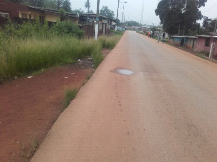 1.1.7. 3.1. Voies urbainesCette partie avec son titre évocateur consiste à présenter les voies urbaines de la ville. En effet, le réseau routier de la commune de Tchibanga est composé essentiellement de deux types de voies qui se caractérisent par : - des voies bitumées ; - des voies en latérites ou non bitumées. 3.1.2. Voies bitumées Cette voirie urbaine comprend un linéaire de voies revêtues en bitume évalué à 12,5 Km dans le 1er Arrondissement et un linéaire de voies revêtues de 10,50 Km dans le 2ème Arrondissement soit un linéaire bitumé communal de 22,55 Km27(*). Les trottoirs sont inexistants dans l'ensemble de la voirie et le phénomène de l'érosion qui tend à faire son apparition aux abords de celle-ci. Nous avons aussi remarqué la présence des hautes herbes qui réduise l'emprise de la route. Une des particularités du réseau routier urbain est l'inexistence des trottoirs (photos 5et6). L'occupation anarchique de certains trottoirs existants par les petits commerçants et des places de stationnement et si elles existent ne sont que dans un sens pose d'énormes difficultés, rendant la circulation alternée sur les artères de voies secondaires. Photo5 : Axe BiboraMinzanzala Photo6 :Axe carrefour Saint Joseph carrefour commercial