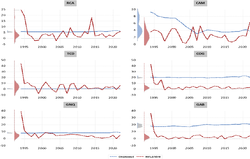Section 2 : Spécification des modèles de l'étude.Dans cette partie de notre travail, nous présenterons, d'une part, les variables retenues pour notre étude puis, en d'autre part, nous présenterons la spécification de nos modèles. 2.1- Choix des variables du modèle Dans cette section, nous procèderont dans un premier temps par présenter les faits stylisés de la relation inflation-chômage en CEMAC avant de présenter les différentes variables retenues pour l'étude. Faits stylisés : i) Evolution comparée entre l'inflation et le chômage dans les pays de la CEMAC Depuis janvier 2002, les pays de la CEMAC ont adopté des critères de surveillances multilatérales sur bon nombre d'indicateurs économiques parmi lesquels l'inflation, dont l'objectif de la politique monétaire consiste à veiller à ce que celle-ci soit inférieure ou égale à la norme de 3%. C'est l'évolution comparée de cette dernière que nous allons analyser pour tous les six pays de la CEMAC de 1994 à 2022, dans le graphique suivante : Graphique 5 : Evolution croisée de l'inflation et du chômage dans les six pays de la CEMAC.