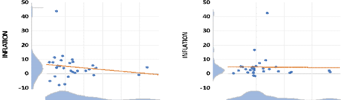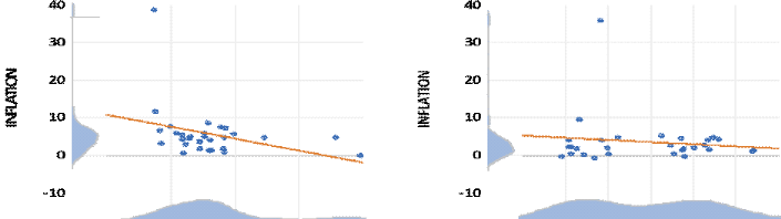 Source: L'auteur sur logiciel Eviews13, à partir des données de la Banque Mondiale et BEAC. Il apparait globalement de ces graphiques que l'évolution de l'inflation semble erratique que celle du chômage dans l'ensemble des pays de la CEMAC, ce qui laisse entrevoir une évolution non linéaire et non proportionnelle des deux phénomènes. Dans tous les pays de la zone, le pic de l'inflation se situe en 1994, sans doute lié à la dévaluation du franc CFA. En dehors de ce pic, l'inflation a toujours été modérée. Quant au chômage dans chacun de ces pays, il évolue de manière stable. Cependant, dans certains pays, l'inflation semble plus prononcée que le chômage (Tchad, Guinée. Eq et RCA) tandis que dans d'autres c'est le chômage qui semble le plus prononcé (Gabon et Congo), à l'exception du Cameroun qui se démarque par ses niveaux d'inflation et de chômage relativement modérés. ii) Dynamique de la relation inflation-chômage dans les pays de la CEMAC Depuis dans la littérature économique, la relation entre l'inflation et le chômage est sujette à des controverses. Pour certains auteurs la relation est inverse à court et à moyen terme tandis que pour d'autres, elle serait uniquement valide à court terme. Ainsi, à moyen-long terme, les deux phénomènes évoluent dans le même sens. C'est de ces deux points de la littérature qu'il s'agit d'analyser dans le graphique suivante : Graphique 6 : Evolution de la relation inflation-chômage dans les six pays de la CEMAC
