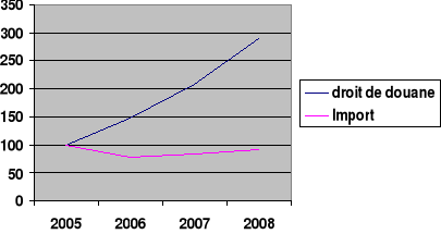 Au regard des données du tableau, le montant de doits de douane n'ont cessé d'augmenter depuis 2005, l'année prise comme référence. Entre cette année et 2008, le taux d'accroissement à avoisiner 190 %. En d'autres termes, pour avoir le niveau de 2008, il faudra multiplier environ par 3 la valeur CIF de 2005.