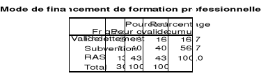 Source : Résultats de nos enquêtes Les dirigeants interviewés déclarent qu'il existe un budget alloué (100%) à la formation mais cependant compte tenu de l'insuffisance de ce budget ils ont recours à des modes de financement externes (endettement 16,7% et subventions 40,0%). SECTION 2 : Analyse Des Implications Des Politiques De Formation Dans Les Etablissements De Microfinance. L'interprétation des résultats, consiste pour nous à décrire à partir des résultats, le niveau d'intégration de la formation professionnelle dans les EMF de Douala. Grâce aux types de formation valorisés, à la fréquence des séances de formation par an, et au fonds alloués à cette activité, nous en déterminerons le statut et ferrons quelques suggestions pour améliorer cet état des faits.